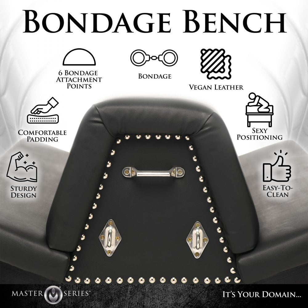 Transform your space by adding a classic bondage bench as the centerpiece of your pleasure. The classic design and smooth, black, vegan friendly leather with bold metal accents stand out and invite you to give in to your darker desires.