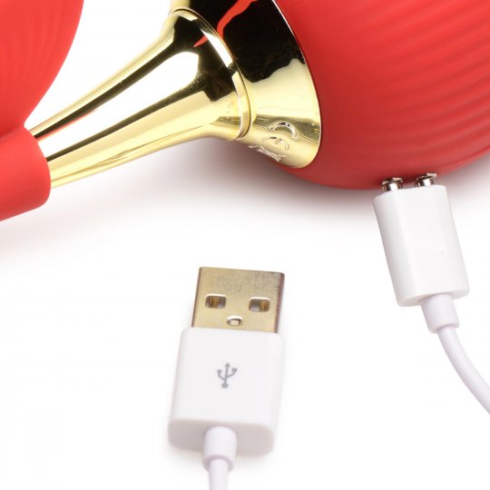 Enjoy 10 different suction modes to tease and tantalize your little pearl. The stem of the rose is a golden rod with a round, beaded tip in the shape of a ball. Delight in an extra 10 vibration modes to enhance your pleasure as they rumble down the shaft of the stem and directly into the rod. The design of the stem allows you to pinpoint your pleasure points with targeted vibration for personalized satisfaction.