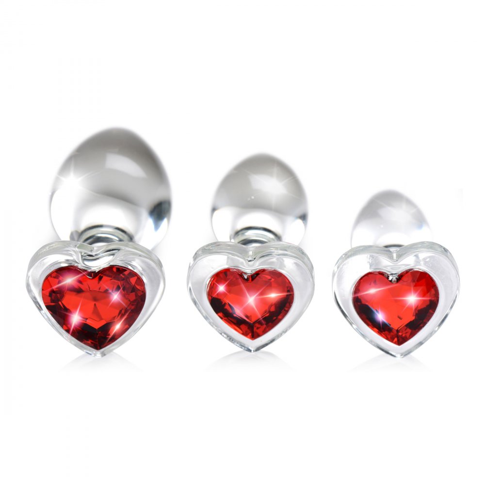 Decorate your derriere with a sparkling red heart! Choose from 3 graduated sizes to display your love between your cheeks with these see-through glass butt plugs - the solid mass and smooth surface fills your backdoor with a satisfyingly hard sensation!