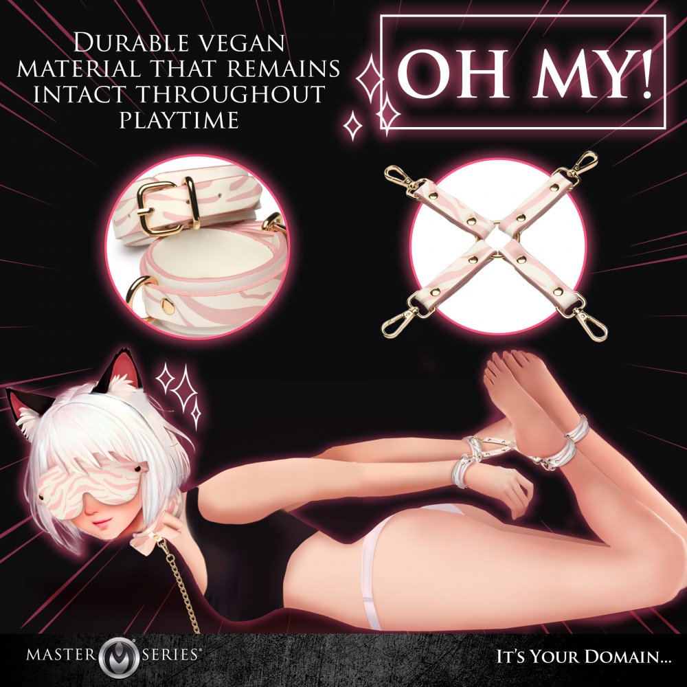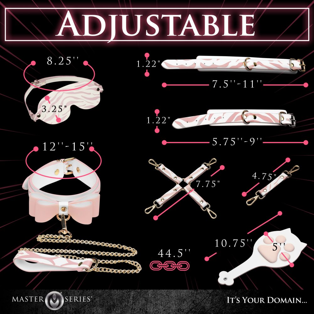 Included in the kit are pairs of wrist and ankle cuffs, a kitty collar with a bow, faux leather blindfold, a 4 strap hogtie to hold wrists and ankles together, and an adorable kitten-paw paddle!