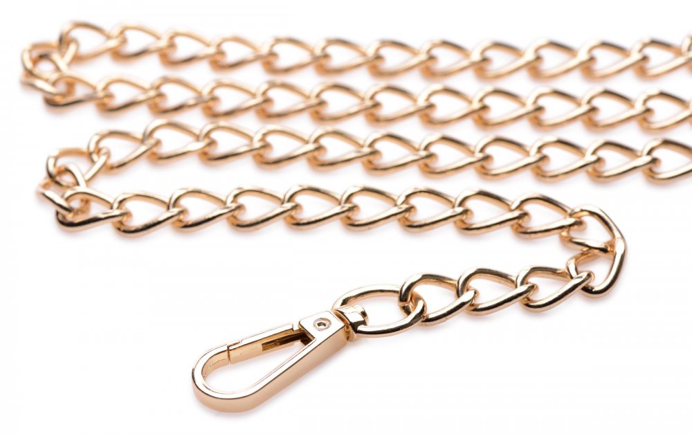 The clasp hook at the end of the gold chain easily snaps on to most D-rings and collar styles so you can clip on and play with ease.
